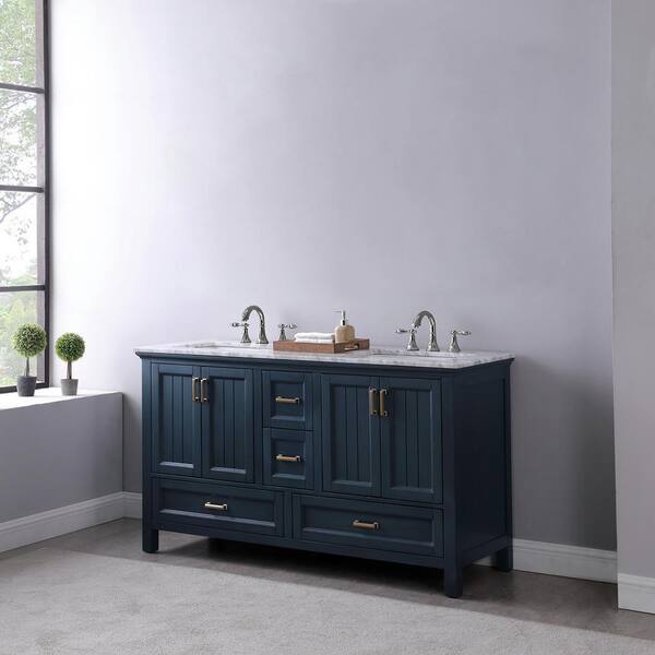 Isla 60 in. Bath Vanity in Classic Blue with Carrara Marble Vanity Top in White with White Basins