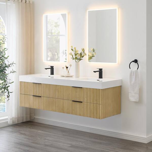 Livia 72 in. W Double Sink Floating Bath Vanity in Nature Brown with White Stone Top and Mirror