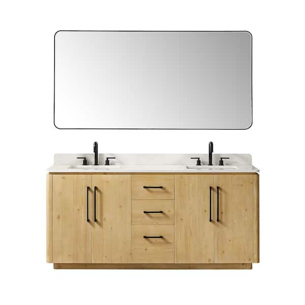 Serene 72 in. Double Freestanding Nature Brown Bath Vanity with Grain White Engineered Stone Top Assembled with Mirror