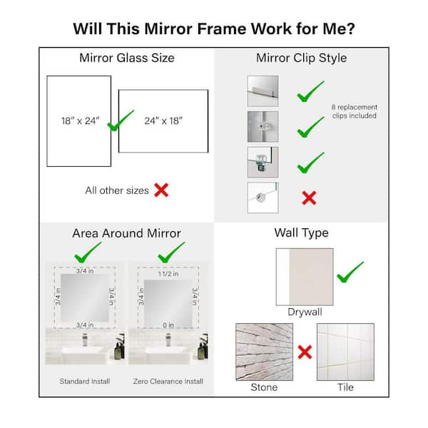 • Designed to fit 18x24 non-beveled frameless mirror