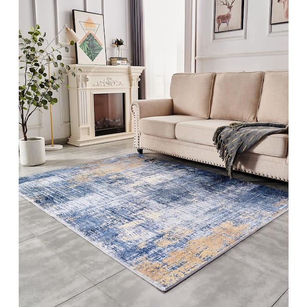 Zara Contemporary Blue/Gold 4 ft. x 6 ft. Washable Super Soft with Abstract Design Area Rug