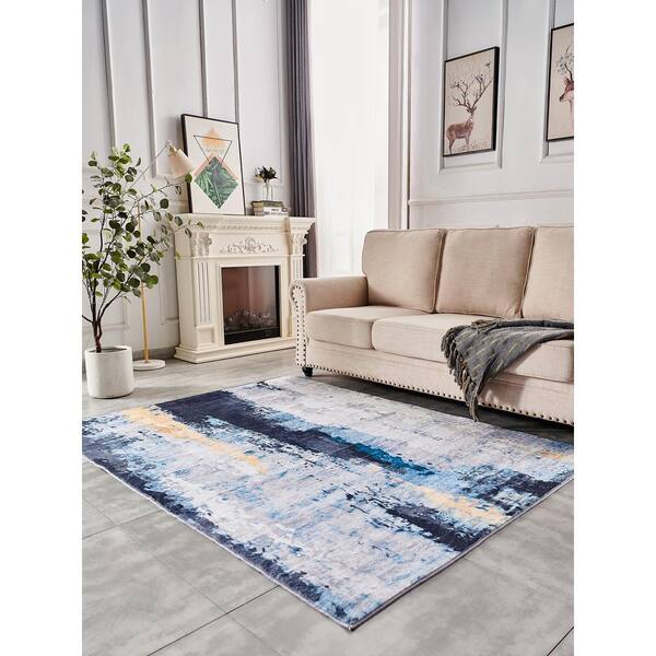 Zara Contemporary Blue-Gray/Yellow 3 ft. x 5 ft. Washable Super Soft with Abstract Design Area Rug