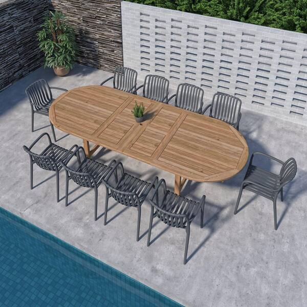 Elmina 11-Piece Solid Teak Wood 100% FSC Oval Patio Dining Set Grey