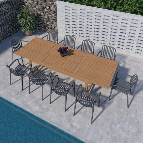 Takamaka 11-Piece Teak Finish Wood 100% FSC Rectangular Patio Dining Set Grey