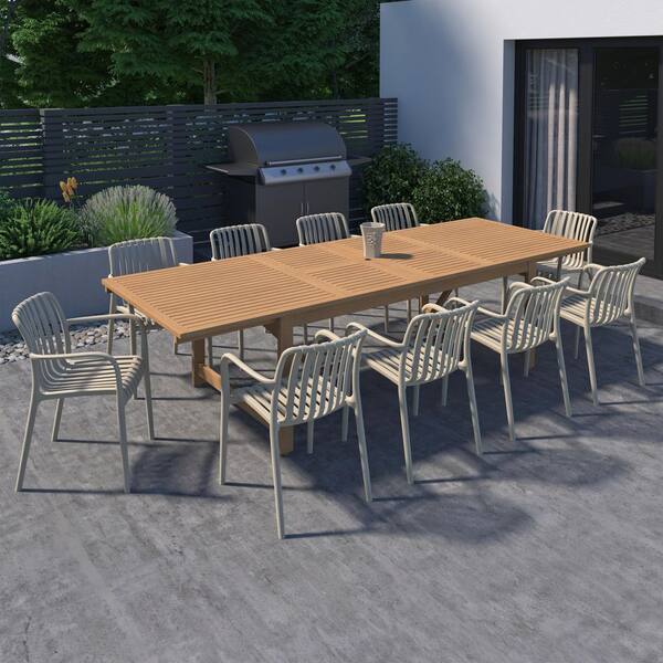 Takamaka 11-Piece Teak Finish Wood 100% FSC Rectangular Patio Dining Set Sand