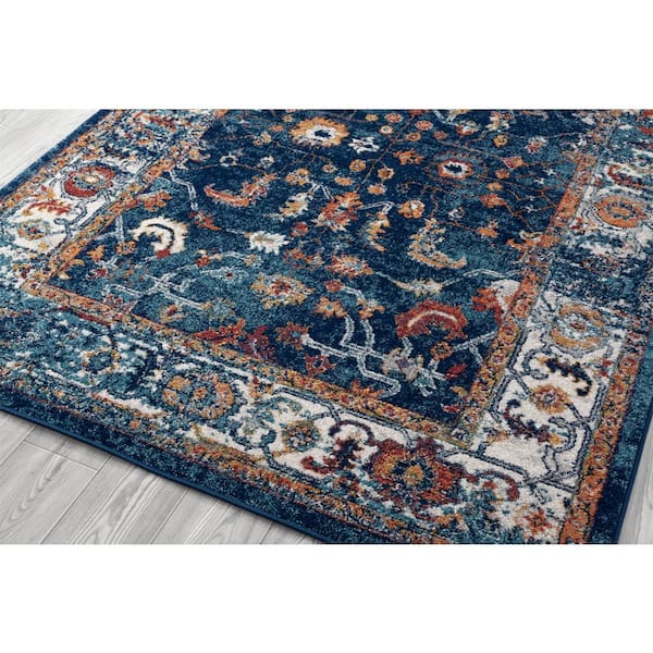 Alexandria 4 x 6 Navy Bordered Pattern Area Rug for High Traffic Living Room Dining Room Bedroom
