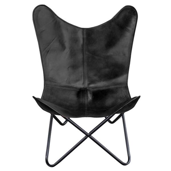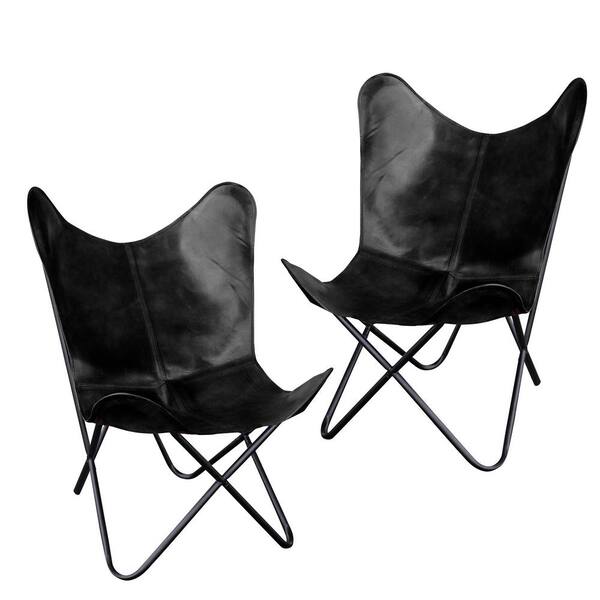 Black Natural Leather Butterfly Chair (2-Piece Set)