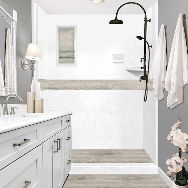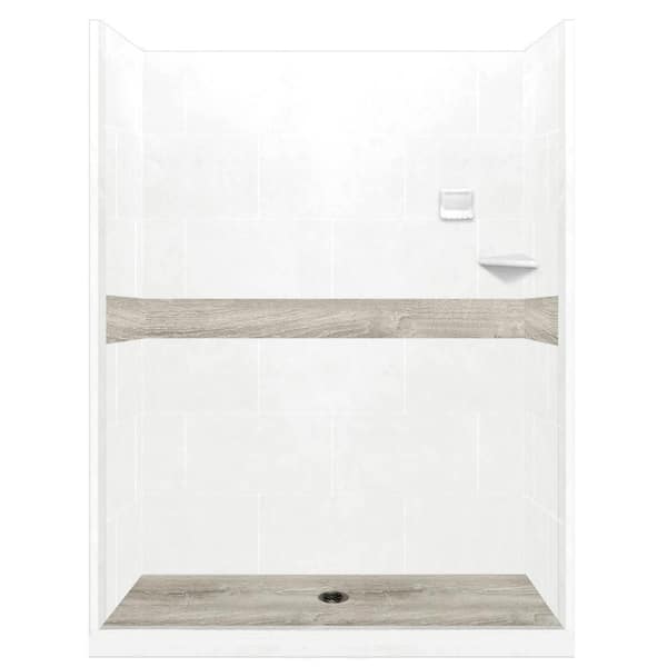 Sterling Oak Pan and Walls 34 in. x 60 in. x 80 in. Center Drain Alcove Shower Kit in Natural Buff, Old Bronze Finish