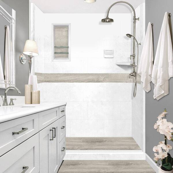 Sterling Oak Pan and Walls 34 in. x 60 in. x 80 in. Left Drain Alcove Shower Kit in Natural Buff and Nickel Hardware