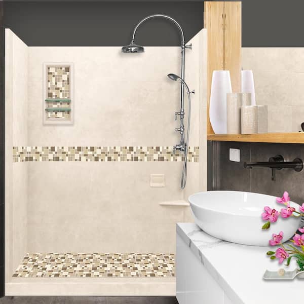 Tuscany 60 in. L x 30 in. W x 80 in. H Left Drain Alcove Shower Kit with Shower Wall and Shower Pan in Desert Sand
