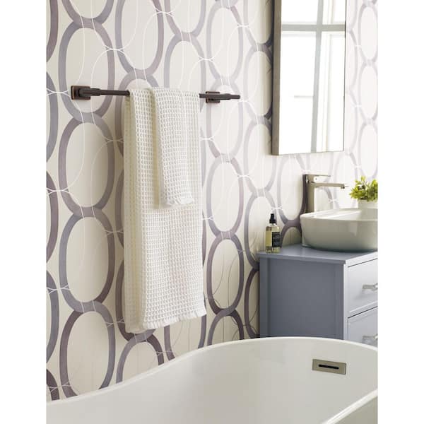 • Towel bar in oil-rubbed bronze adds a touch of sophistication