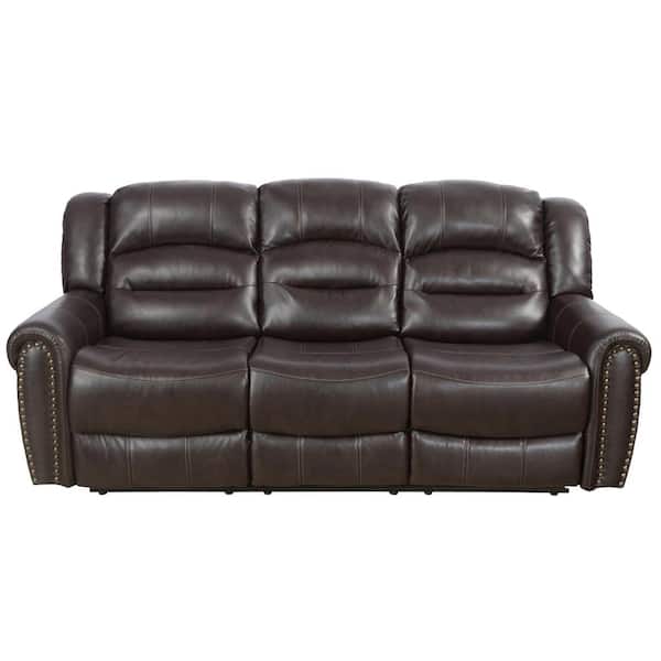 85 in. W Round Arm Faux Leather Rectangle Reclining Sofa in. Dark Brown