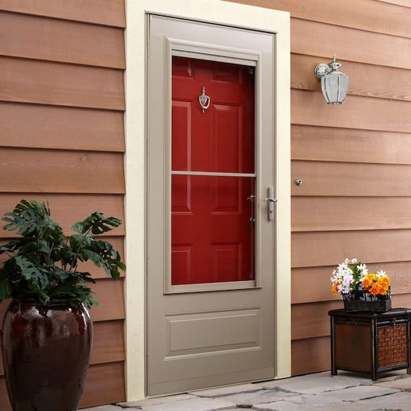 400 Series 36 in. x 80 in. Almond Universal 3/4 Light Retractable Aluminum Storm Door with Brass Hardware
