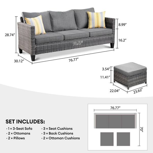 Andes Gray Wicker Outdoor Couch Patio Sofa with Dark Gray Cushions and Ottoman