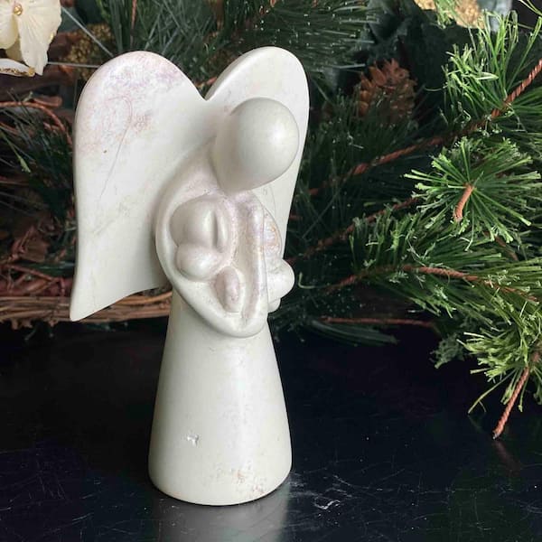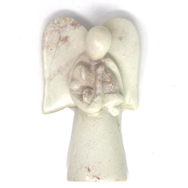 Angel Holding Dog Soapstone Sculpture in Cream, Natural Stone