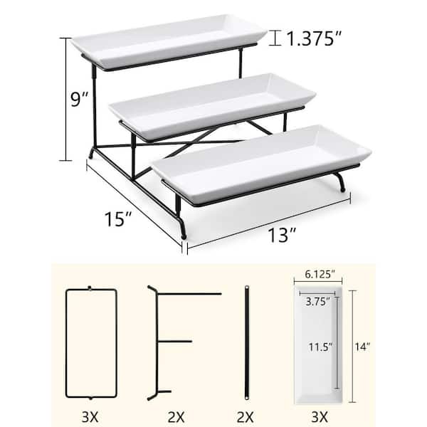 14 in. Porcelain 3-Tier Rectangular Serving Tray Set with Collapsible Sturdier Stand and Cross Bars, Black and White