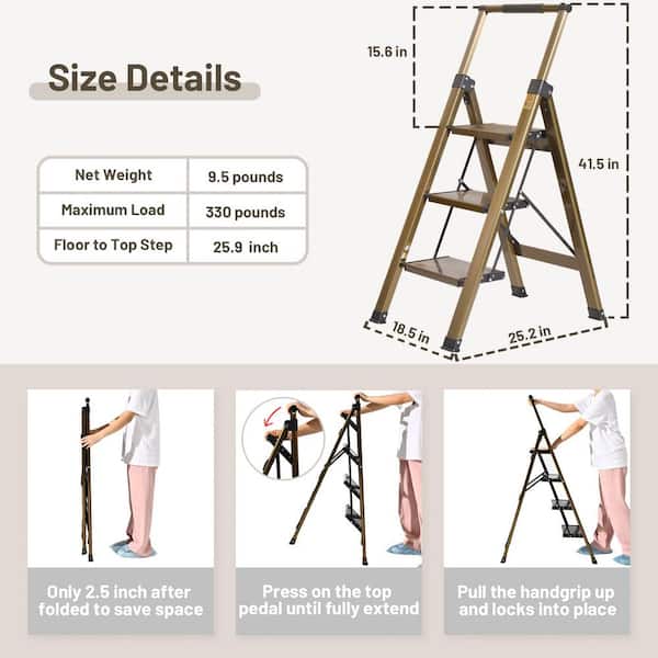 3.45 ft. Aluminum Brown Gold 3 Step Stool with Retractable Handrail, 330 lb. Folding Stool Ladders for Garage Library