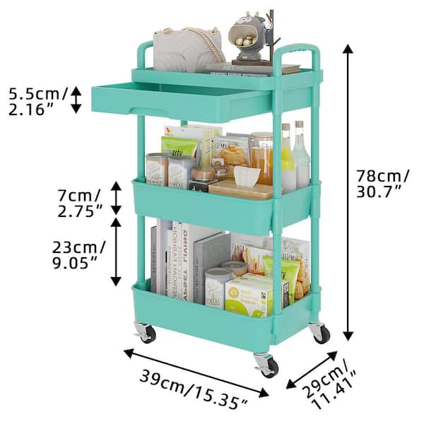 3-Tier Rolling Utility Serving Cart in Green with Drawer, Plastic Shelf and Metal Wheels