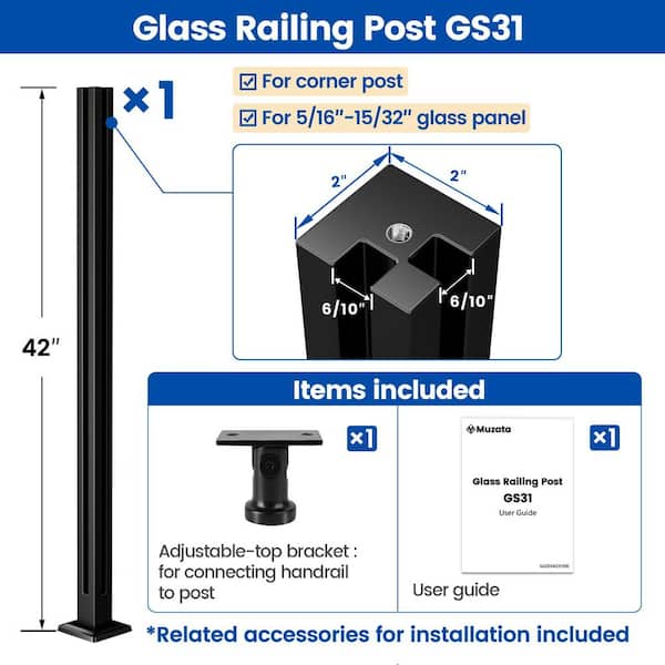 42 in. 1-Pack Glass Railing Corner Post, Stainless Steel Black Glass Railing Designed for Level Stair