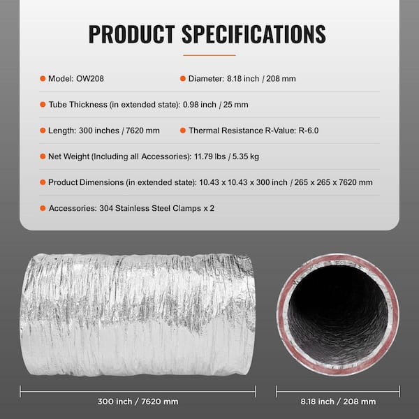 8 in. x 25 ft. Dryer Vent Hose, Heavy-Duty 3-Layer Insulated Flexible Duct R-6.0 Flame Resistance Value