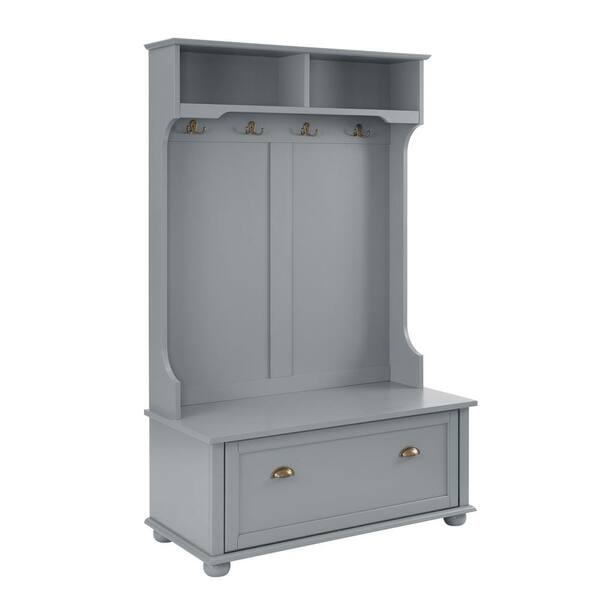 Gray Hall Tree Entryway Bench with Open Shelves, Shoe Cabinets and Solid Wood Feet