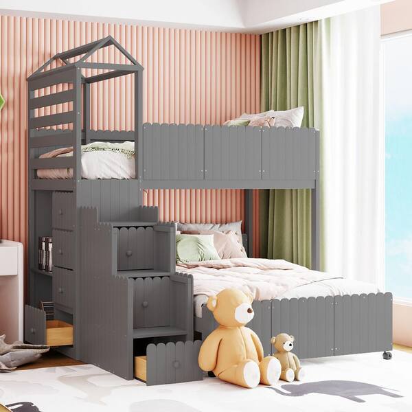 Gray Twin over Full Bunk Bed with Stairs, 7 Drawers, 2 Shelves, Wheels, Farmhouse Separated House Bunk Bed
