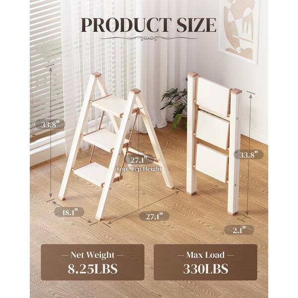 Reach 27.1 in. 3 Step 33.8 in. Capacity White Elegant Look Ladder, Aluminum Folding Step Stool with Wider Pedal
