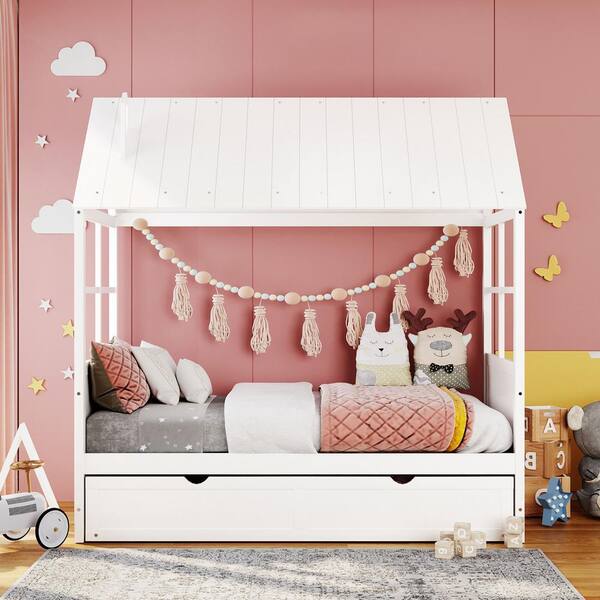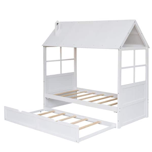 White Twin Size Wood House Bed With Twin Size Trundle, Daybed for 2