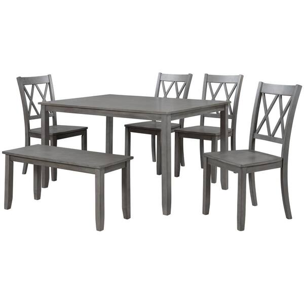 Antique Graywash 6-Piece Wood Rustic Table Classical Cross Back Chairs and Long Multifunctional Bench Outdoor Dining Set