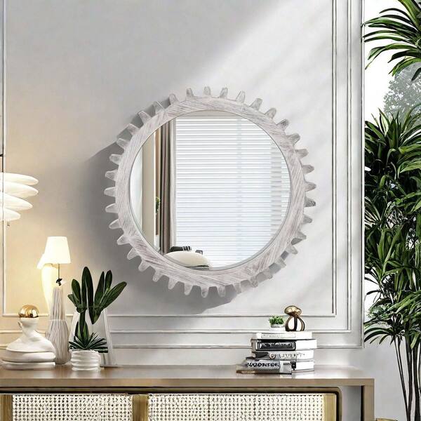 Antique White Washed 26 in W x 26 in. H Round Wood Framed Mirror
