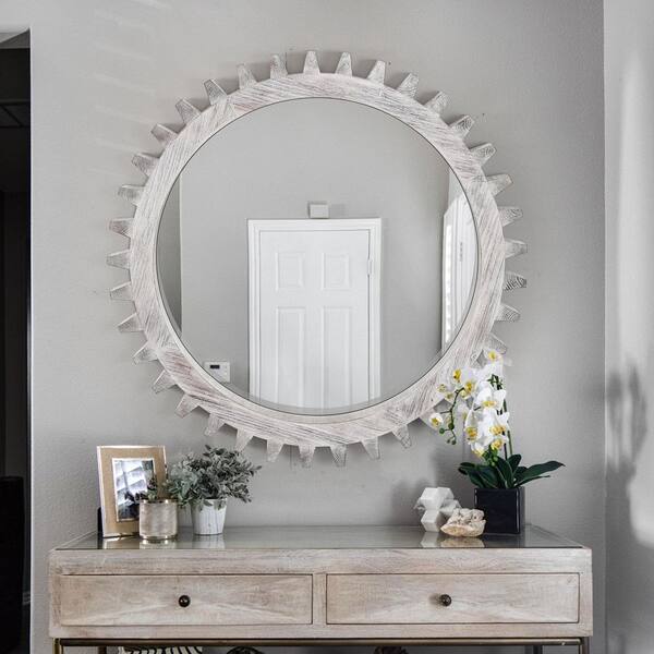 Antique White Washed 33.86 in. W x 33.86 in. H Vintage Round Gear Shape Wood Framed Decorative Wall Mirror