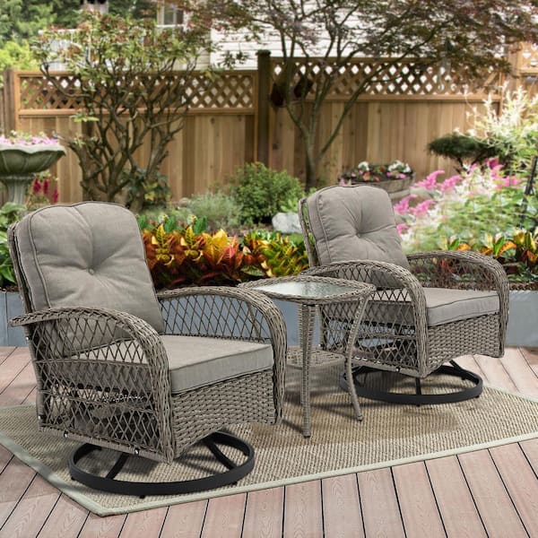 Natalie 3-Piece Gray Wicker Rocking Patio Conversation Set With Tempered Glass Tabletop and Gray Polyester Cushion