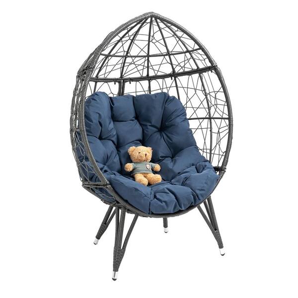 Wicker Patio Egg Chair Outdoor Lounge Chair for Garden, Balcony with Navy Cushion