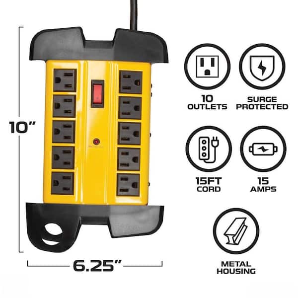 10-Outlet Heavy Duty Surge Protector Power Strip with Built-in Circuit Breaker-Metal Surge Suppressor Black and Yellow