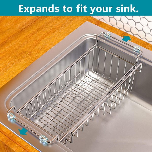 Stainless Steel Expandable Over Sink Sponge Holder Organizer Rack for Kitchen with Drying Divider Railing 14.5-22
