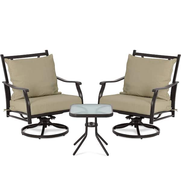 3-Piece Metal Swivel Outdoor Chairs Patio Conversation Set with Khaki Cushions and Toughened Glass Table