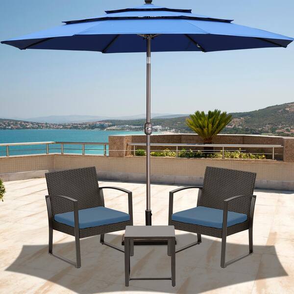 3-Piece Wicker Patio Conversation Set Coffee Table and 2 Rattan Chair with Blue Cushions