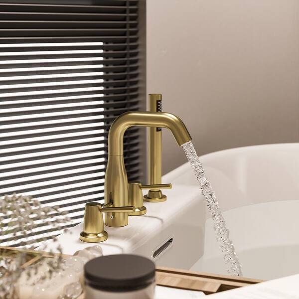 Modern 2-Handle Deck-Mount Roman Tub Faucet with Handshower in Brushed Gold