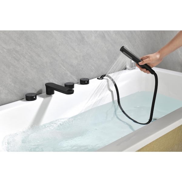 Modern 3-Handle Deck Mount Roman Tub Faucet with Hand Shower in Matte Black