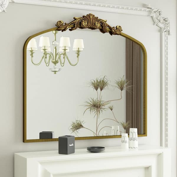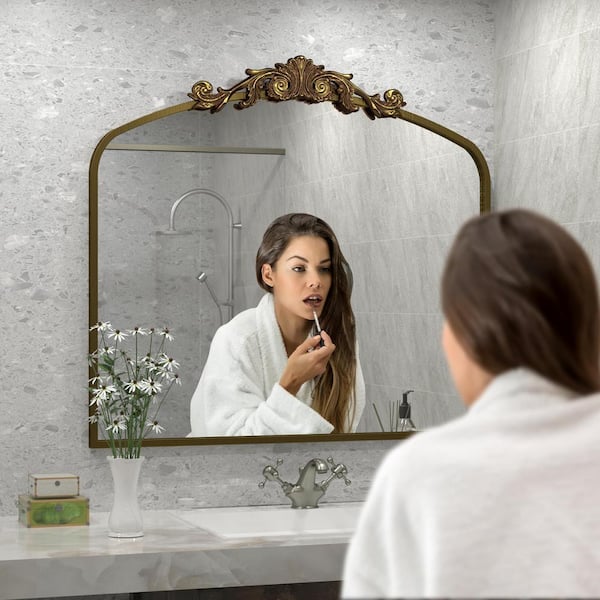 36 in. W x 30 in. H Arch Aluminum Alloy Framed French Cleat Mounted Baroque Wall Decor Bathroom Vanity Mirror in Gold