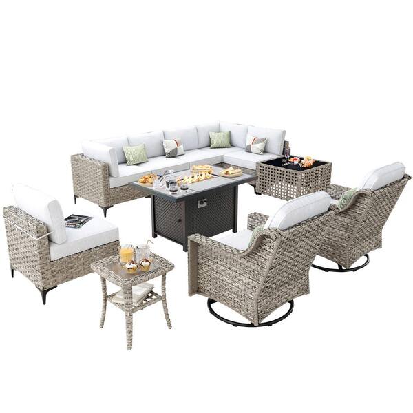 Apollo 11-Piece Wicker Rectangular Fire Pit Sets and Swivel Rocking Chairs with Light Gray Cushion