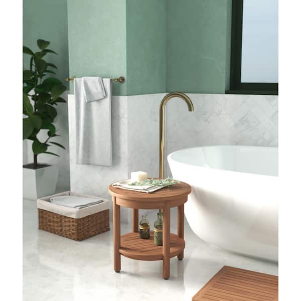 Patented 18 in. x 18 in. Omega Round Freestanding Teak Shower Bench with Shelf Walk in Shower Seat