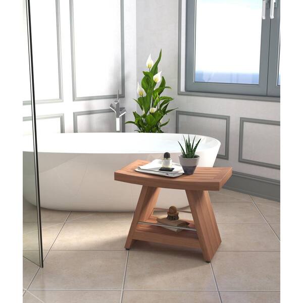 Patented 24 in. x 14 in. Asia Freestanding Teak and Stainless Shower Bench with Shelf