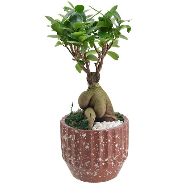 5 in. Ginseng Ficus Bonsai Red Round Speckled Splash Ceramic Planter