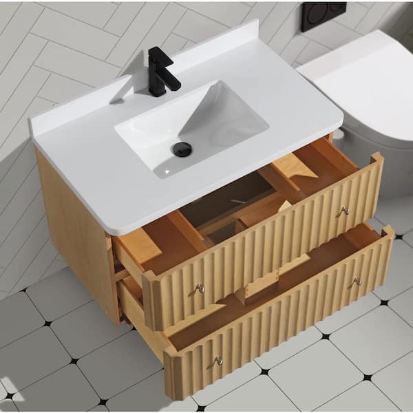 LaJolla 36 in. W x 21 in. D x 22 in. H Single Floating Bath Vanity in Oak w/ Engineered Quartz Top in White White Basin