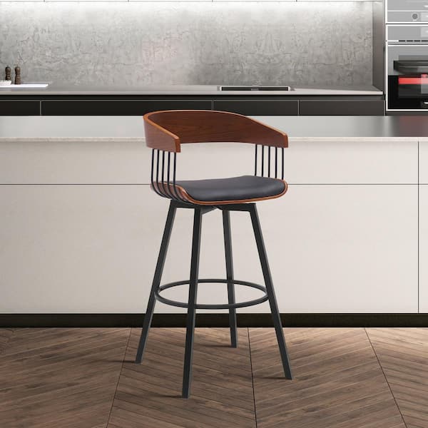 Athena Swivel 31 in. Black/Walnut and Black Metal/Wood Bar Stool with Black Faux Leather Seat