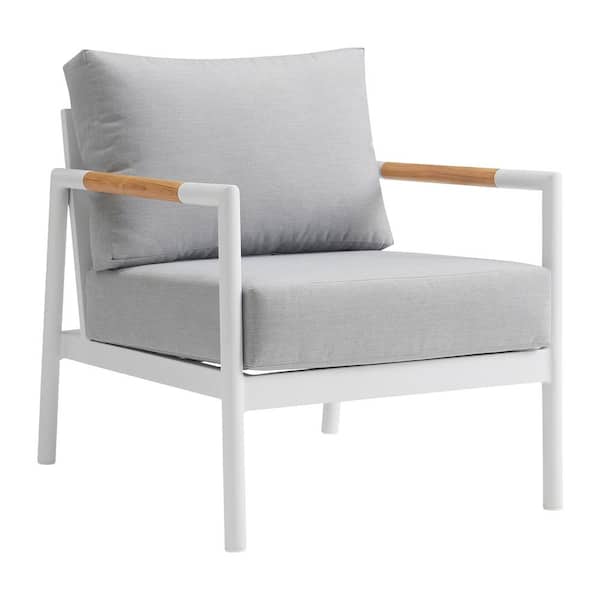 Crown White Aluminum and Teak Wood Outdoor Lounge Chair with Gray Cushion