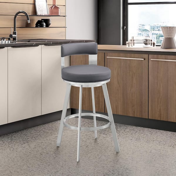 Flynn 30 in. Gray/Silver Low Back Metal Bar Stool with Faux Leather Seat