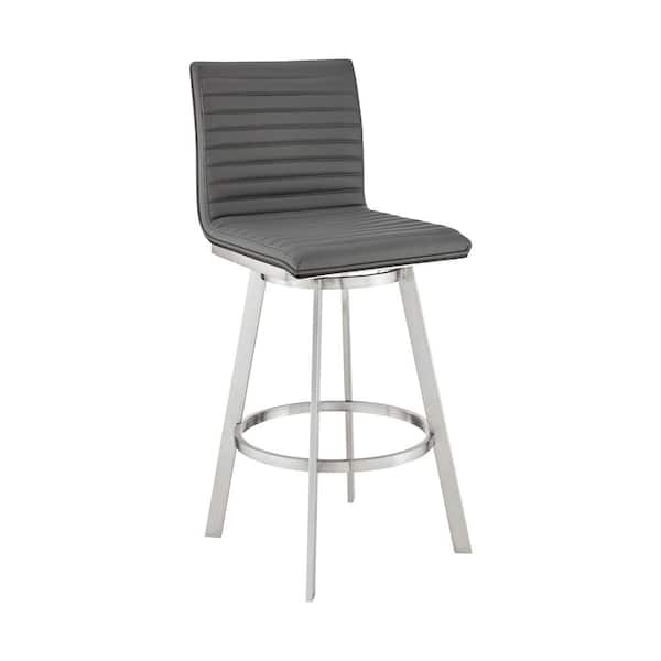 Nikole 26 in. Height Gray Faux Leather and Brushed Stainless Steel High Back Swivel Bar Stool with Black Wood Frame