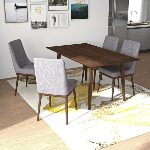 Alena 5-Piece Mid-Century Rectangular Walnut Top 63 in. Dining Set with 4 Fabric Dining Chairs in Gray